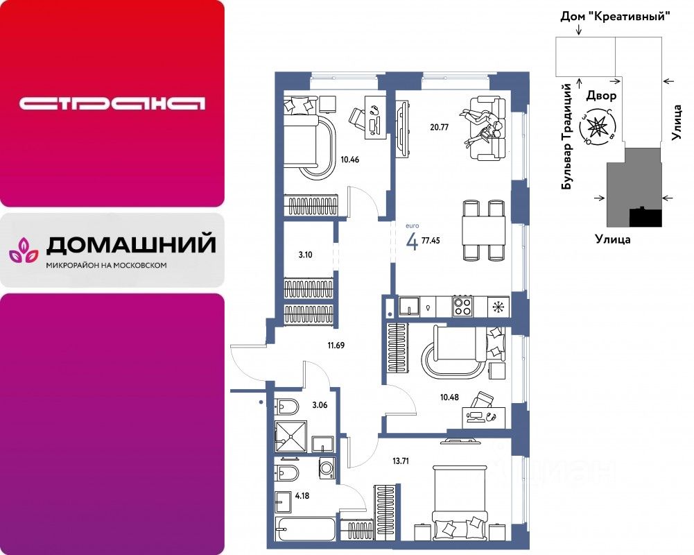 Продается 4комнатная квартира на 7 этаже от застройщика Страна Девелопмент. Площадь квартиры 77,45 кв. м.