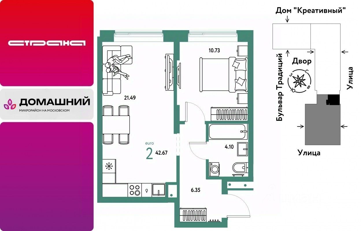 Новая квартира в ЖК "Домашний" напрямую от федеральной группы компаний "Страна Девелопмент". Финансовый партнер — банк "ДОМ.РФ".