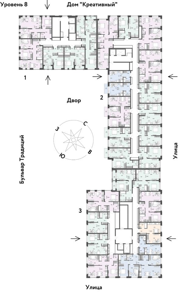 -Сквозные парадные с прозрачными входными группами, колясочными и велосипедными