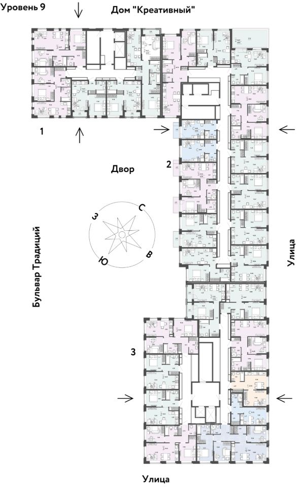 -Сквозные парадные с прозрачными входными группами, колясочными и велосипедными