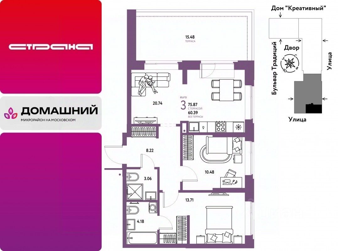 Новая квартира в ЖК "Домашний" напрямую от федеральной группы компаний "Страна Девелопмент". Финансовый партнер — банк "ДОМ.РФ".