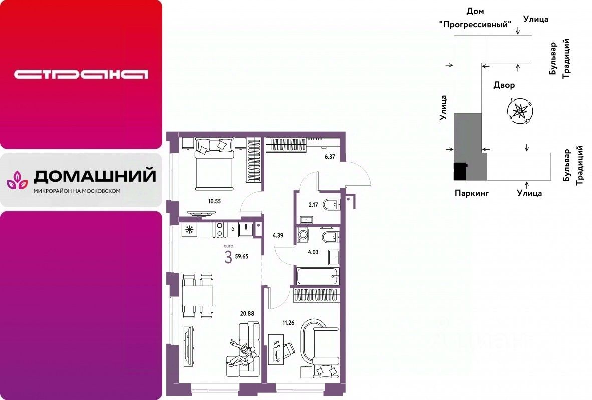 Продается 3комнатная квартира на 6 этаже от застройщика Страна Девелопмент. Площадь квартиры 59,65 кв. м.
