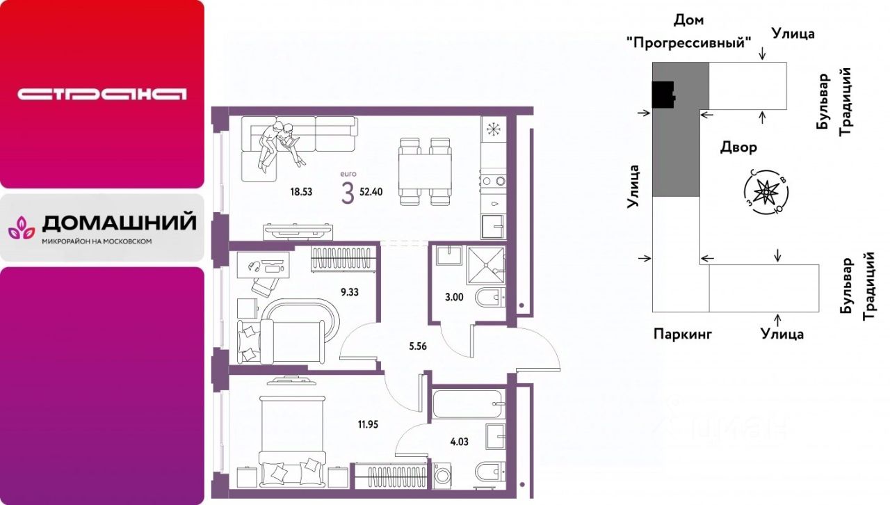 Продается 3комнатная квартира на 3 этаже от застройщика Страна Девелопмент. Площадь квартиры 52,4 кв. м.