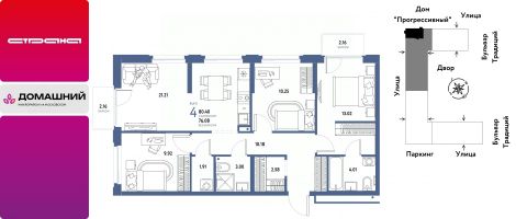 Продается 4комнатная квартира на 4 этаже от застройщика Страна Девелопмент. Площадь квартиры 80,4 кв. м.