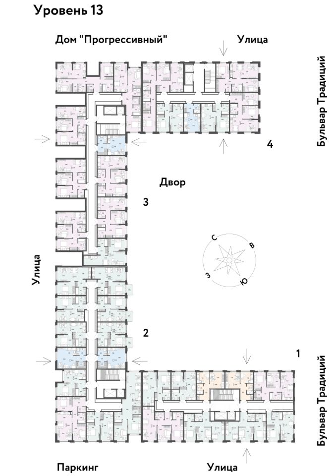 -Сквозные парадные с прозрачными входными группами, колясочными и велосипедными