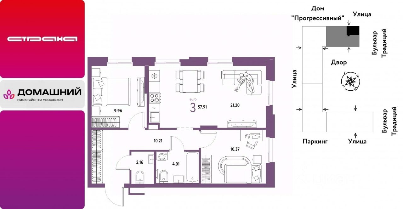 Продается 3комнатная квартира на 2 этаже от застройщика Страна Девелопмент. Площадь квартиры 57,91 кв. м.