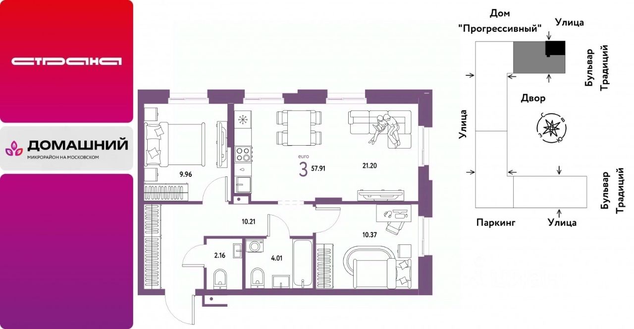 Продается 3комнатная квартира на 8 этаже от застройщика Страна Девелопмент. Площадь квартиры 57,91 кв. м.