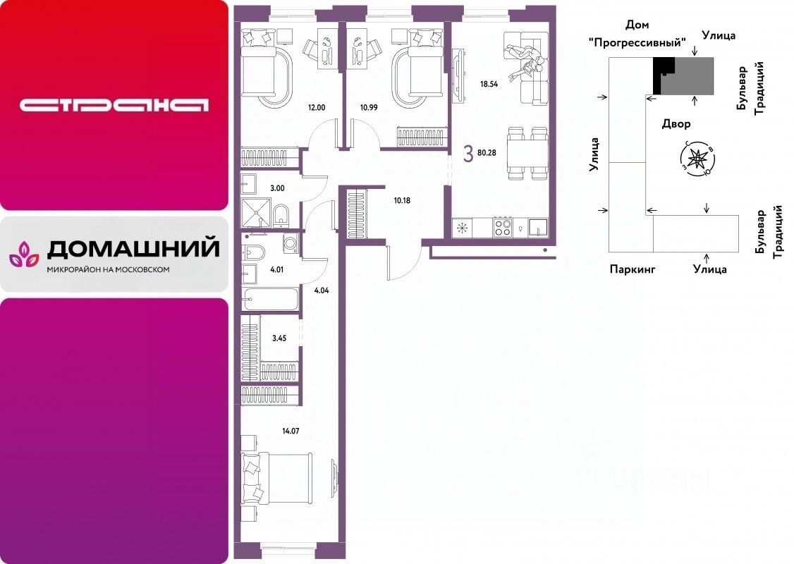 Продается 3комнатная квартира на 9 этаже от застройщика Страна Девелопмент. Площадь квартиры 80,28 кв. м.