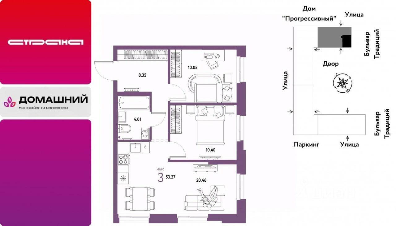 Продается 3комнатная квартира на 13 этаже от застройщика Страна Девелопмент. Площадь квартиры 53,27 кв. м.