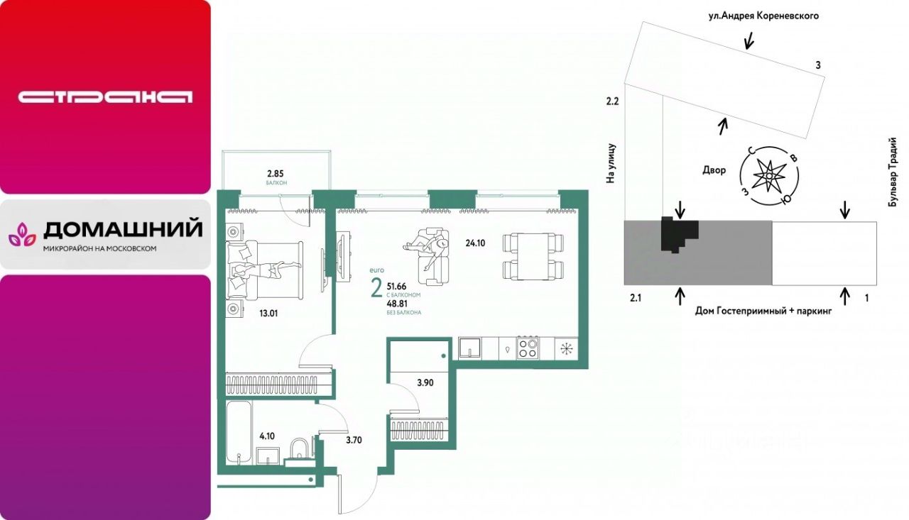 Продается 2комнатная квартира на 6 этаже от застройщика Страна Девелопмент. Площадь квартиры 51,66 кв. м.