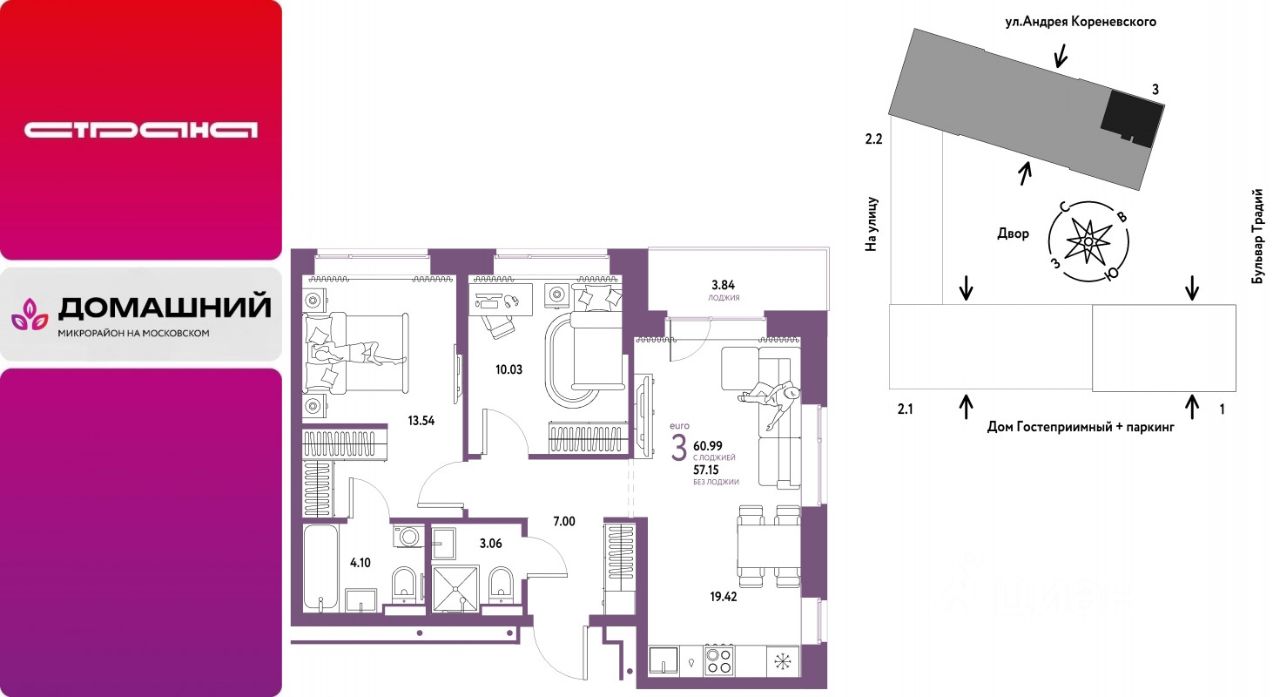 Продается 3комнатная квартира на 13 этаже от застройщика Страна Девелопмент. Площадь квартиры 60,99 кв. м.
