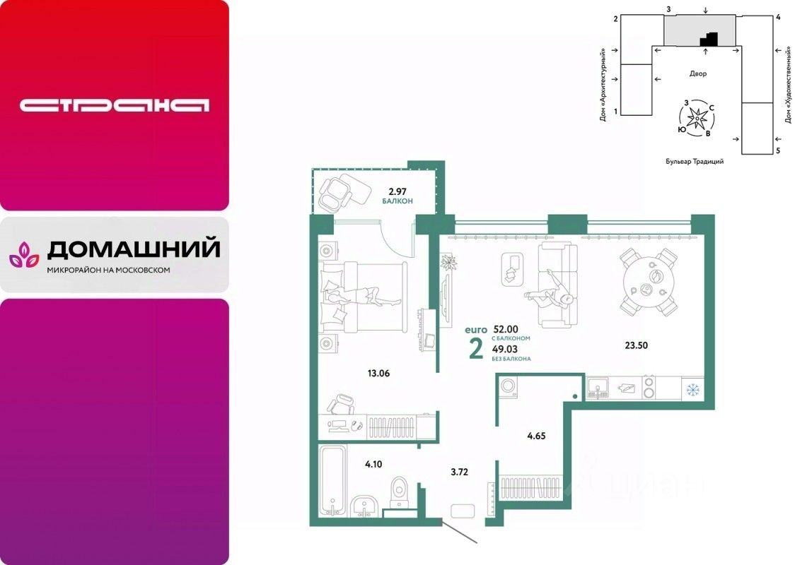 Продается 2комнатная квартира на 10 этаже от застройщика Страна Девелопмент. Площадь квартиры 52 кв. м.