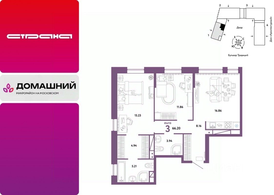 Продается 3комнатная квартира на 13 этаже от застройщика Страна Девелопмент. Площадь квартиры 66,2 кв. м. Стоимость указана без учета акций.
