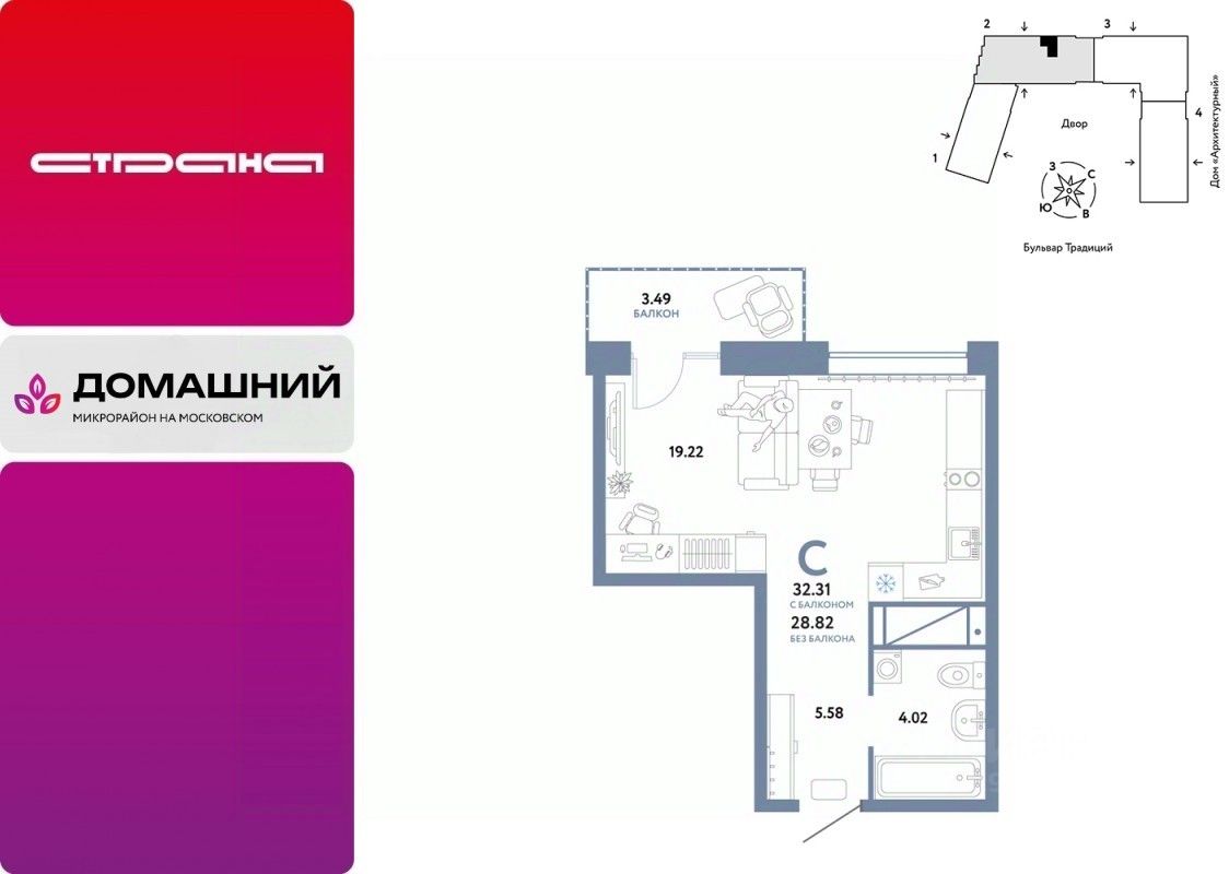 Продается 1комнатная квартира на 7 этаже от застройщика Страна Девелопмент. Площадь квартиры 32,31 кв. м. Стоимость указана без учета акций.