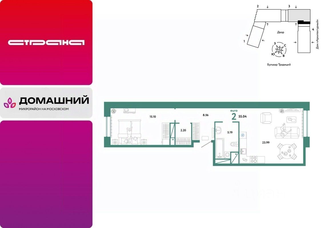 Продается 2комнатная квартира на 11 этаже от застройщика Страна Девелопмент. Площадь квартиры 55,04 кв. м. Стоимость указана без учета акций.