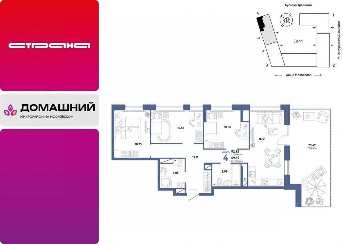 Продается 4комнатная квартира на 9 этаже от застройщика Страна Девелопмент. Площадь квартиры 92,81 кв. м.