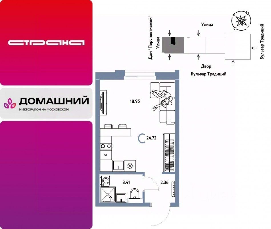 Продается 1комнатная квартира на 2 этаже от застройщика Страна Девелопмент. Площадь квартиры 24,72 кв. м.