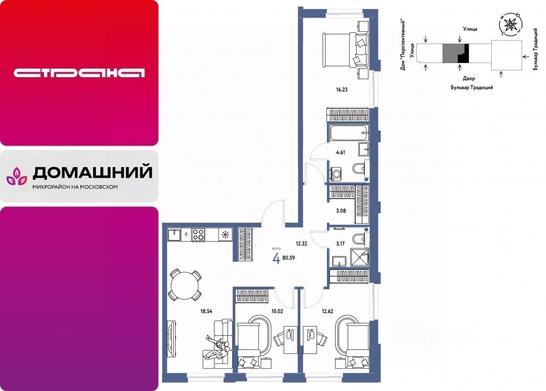 Продается 4комнатная квартира на 9 этаже от застройщика Страна Девелопмент. Площадь квартиры 80,59 кв. м.