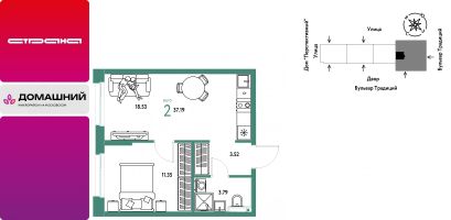 Продается 2комнатная квартира на 9 этаже от застройщика Страна Девелопмент. Площадь квартиры 37,19 кв. м.