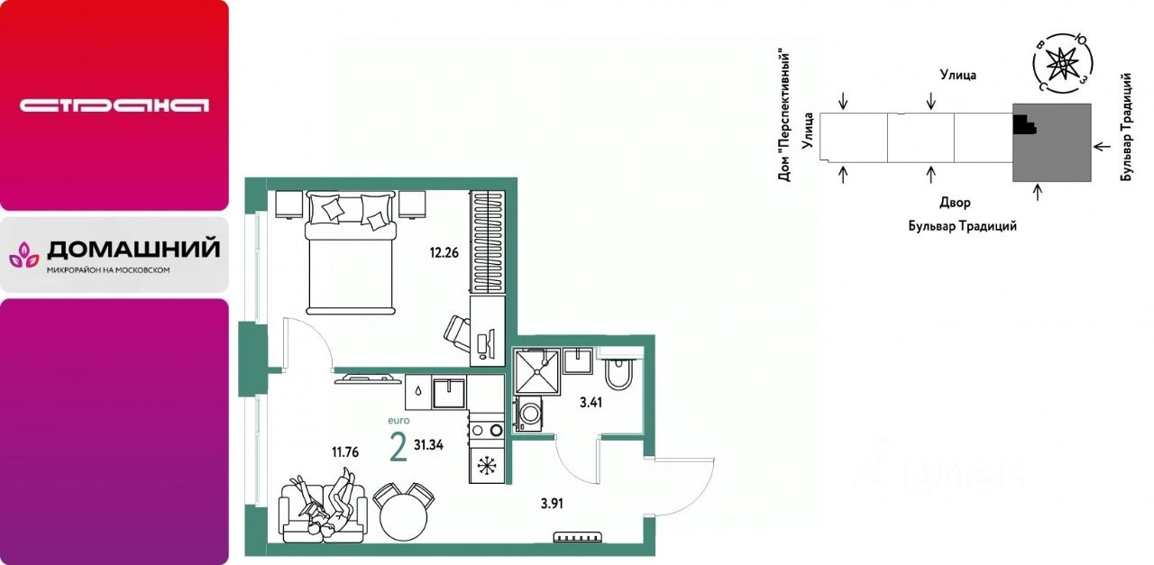 Продается 2комнатная квартира на 11 этаже от застройщика Страна Девелопмент. Площадь квартиры 31,34 кв. м.