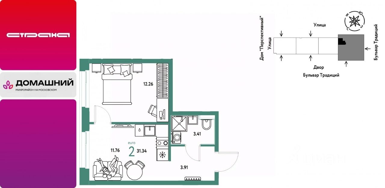 Продается 2комнатная квартира на 12 этаже от застройщика Страна Девелопмент. Площадь квартиры 31,34 кв. м.