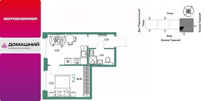 Продается 2комнатная квартира на 13 этаже от застройщика Страна Девелопмент. Площадь квартиры 30,3 кв. м.