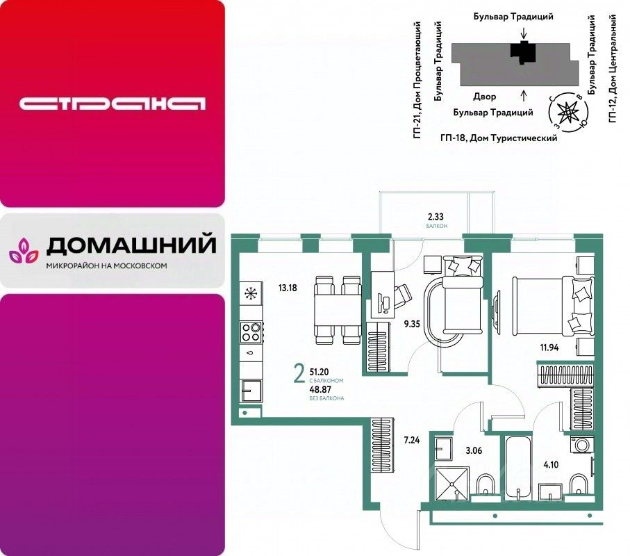 Продается 2комнатная квартира на 9 этаже от застройщика Страна Девелопмент. Площадь квартиры 51,2 кв. м.
