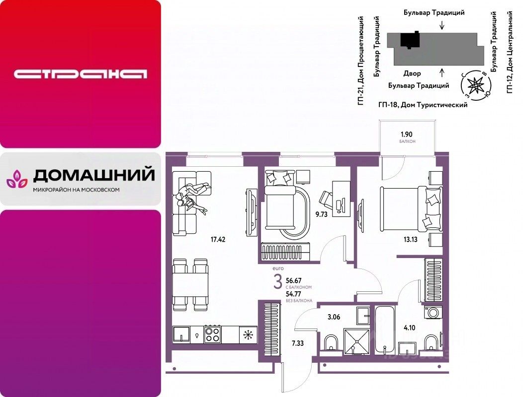 Продается 3комнатная квартира на 10 этаже от застройщика Страна Девелопмент. Площадь квартиры 56,67 кв. м.
