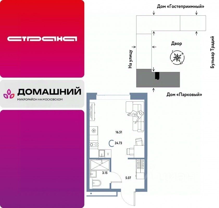Продается 1комнатная квартира на 5 этаже от застройщика Страна Девелопмент. Площадь квартиры 24,73 кв. м.