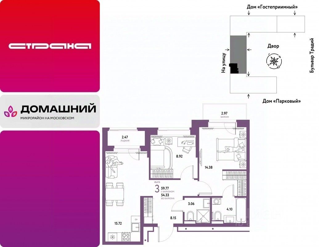 Продается 3комнатная квартира на 4 этаже от застройщика Страна Девелопмент. Площадь квартиры 59,77 кв. м.