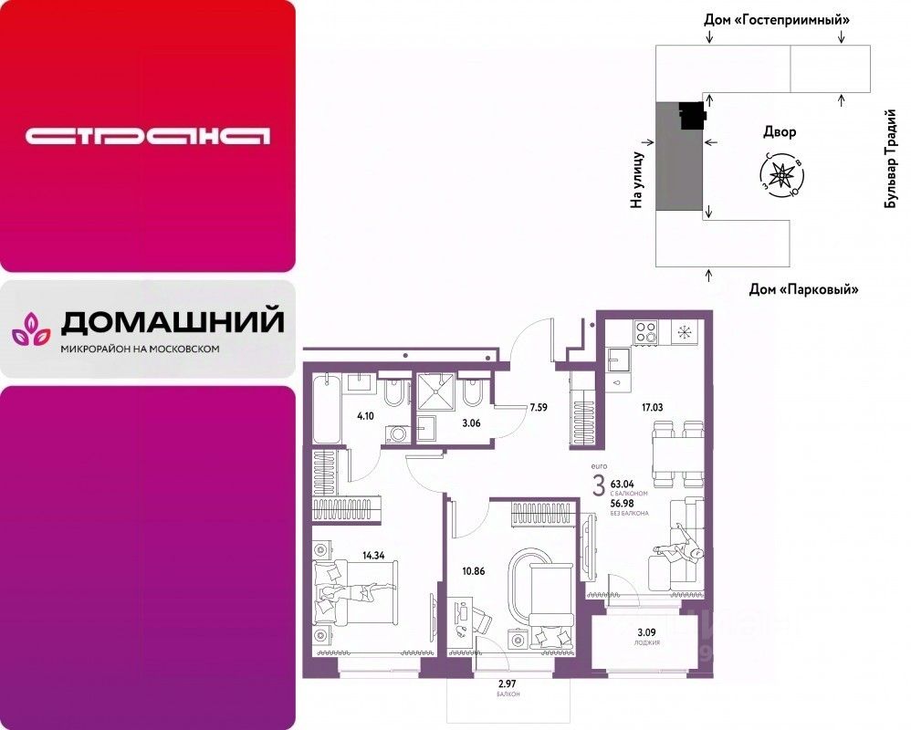 Продается 3комнатная квартира на 6 этаже от застройщика Страна Девелопмент. Площадь квартиры 63,04 кв. м.