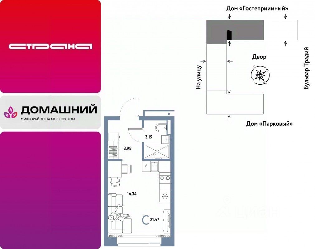 Продается 1комнатная квартира на 2 этаже от застройщика Страна Девелопмент. Площадь квартиры 21,47 кв. м.