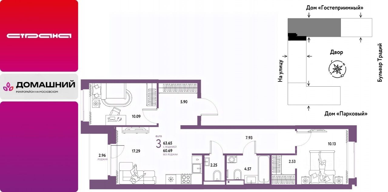 Продается 3комнатная квартира на 11 этаже от застройщика Страна Девелопмент. Площадь квартиры 63,65 кв. м.