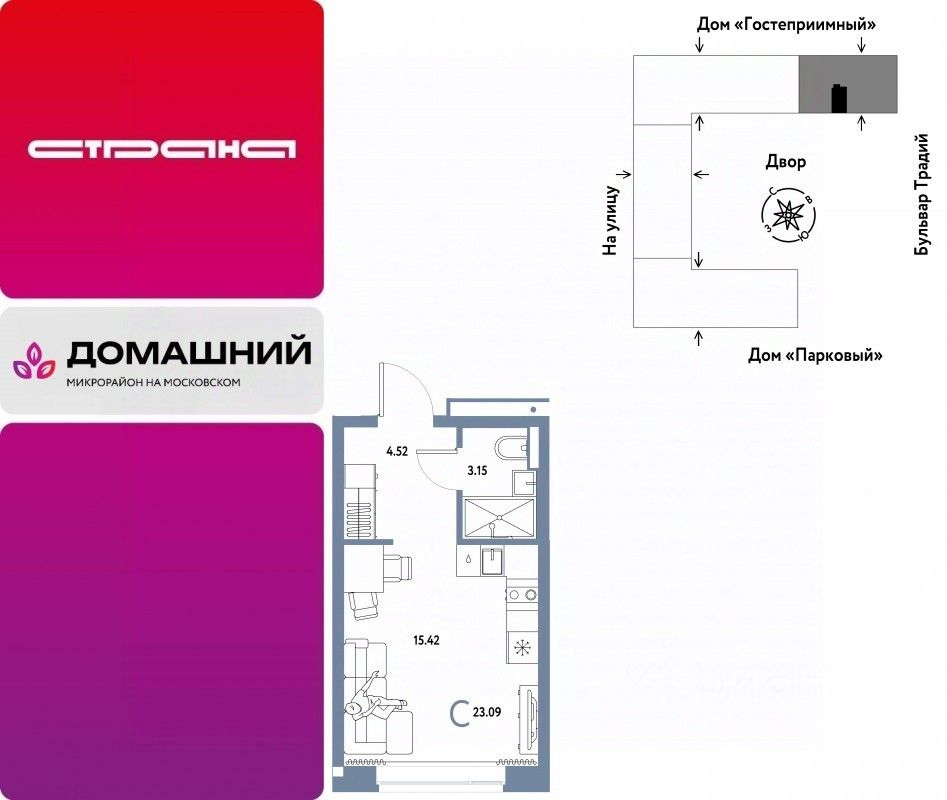 Продается 1комнатная квартира на 4 этаже от застройщика Страна Девелопмент. Площадь квартиры 23,09 кв. м.