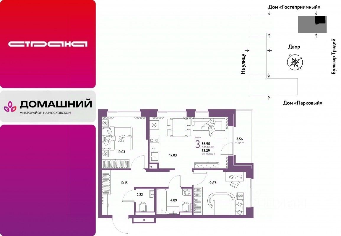 Продается 3комнатная квартира на 10 этаже от застройщика Страна Девелопмент. Площадь квартиры 56,95 кв. м.