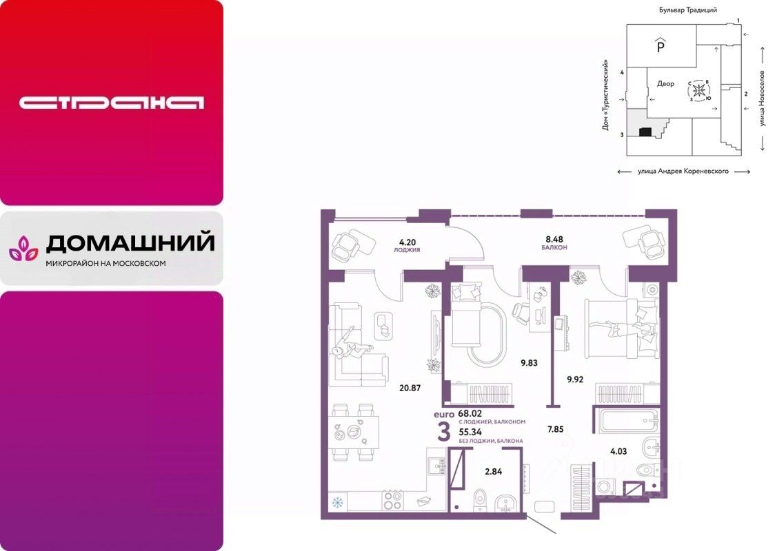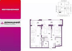 Продается 3комнатная квартира в новом микрорайоне "Домашний" в районе Московского тракта рядом с ТРЦ "Колумб". Общая площадь квартиры 68,02 кв. м. Сдача — в 4 квартале 2024 года.