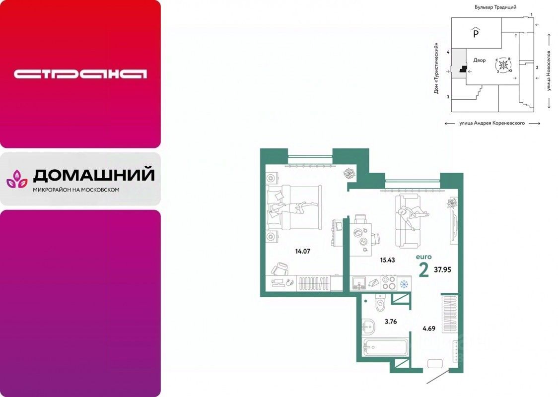 Продается 2комнатная квартира в новом микрорайоне "Домашний" в районе Московского тракта рядом с ТРЦ "Колумб". Общая площадь квартиры 37,95 кв. м. Сдача — в 4 квартале 2024 года.