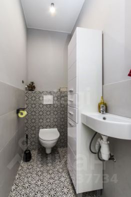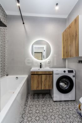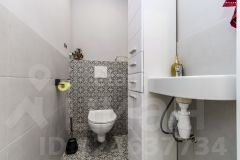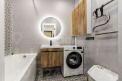 Натяжные потолки с точечной расстоновкой для удобного зонирования. Ванная и туалет отделаны кафельной плиткой в современном стиле.