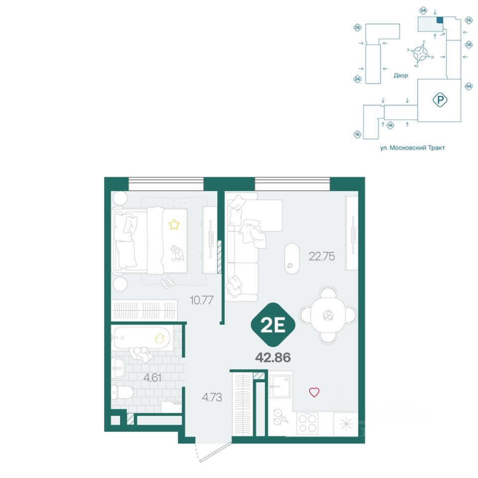 42,86 м²