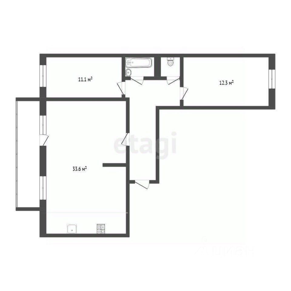 Кухня-гостиная 33,6 кв.м., 2 спальни 11 и 14 кв.м.