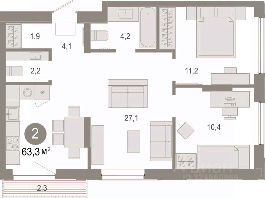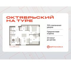 Квартира с кухней-гостиной и двумя спальнями в Октябрьском на Туре. Особенности планировки: второй санузел, гардеробная, предчистовая отделка, балкон.