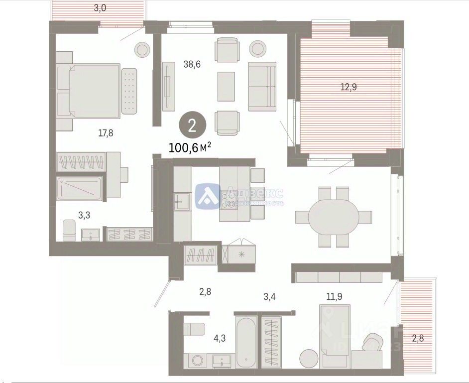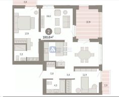 Продается просторная новостройка в жилом комплексе, расположенном на 6 этаже 9-этажного дома. Площадь квартиры составляет 100.59 кв.м., при этом кухня занимает 38.6 кв.м.