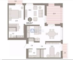 Продается двухкомнатная квартира в новостройке на 4 этаже 9-этажного дома. Общая площадь квартиры составляет 100.59 кв.м., при этом кухня занимает 38.6 кв.м. Квартира продается с черновой отделкой, что дает возможность новому владельцу воплотить в жизнь свои дизайнерские идеи.