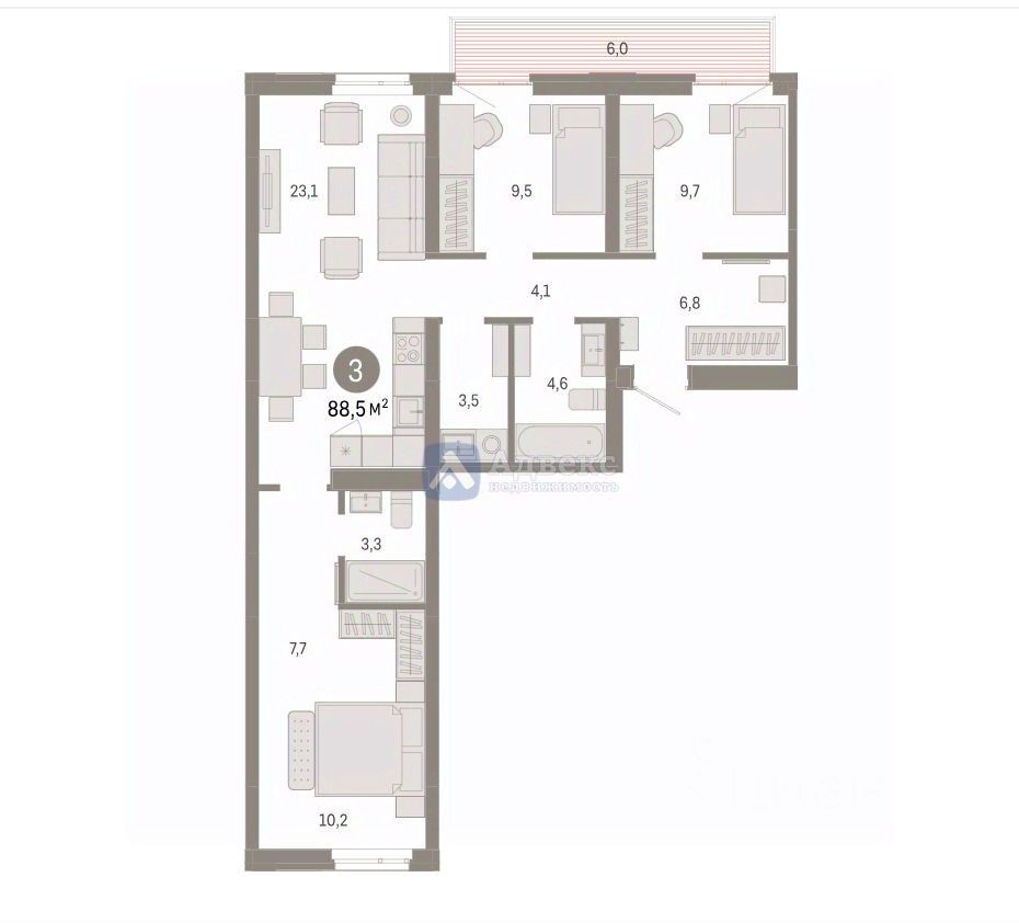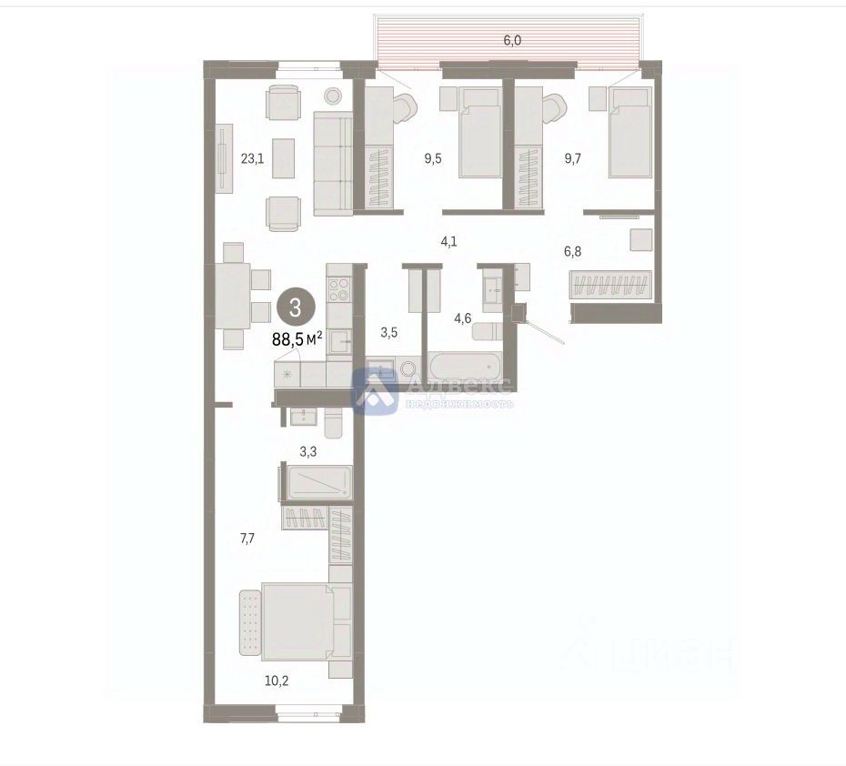Квартира располагается на 4 этаже 8-этажного дома и имеет общую площадь 88.47 кв.м. Особо стоит отметить просторную кухню площадью 23.1 кв.м., где вы сможете комфортно проводить время с семьей или друзьями.