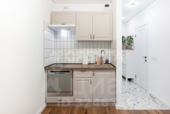 • Пространство студии объединяет зону отдыха и кухню-гостиную с большим диваном-кроватью и тумбой для хранения.