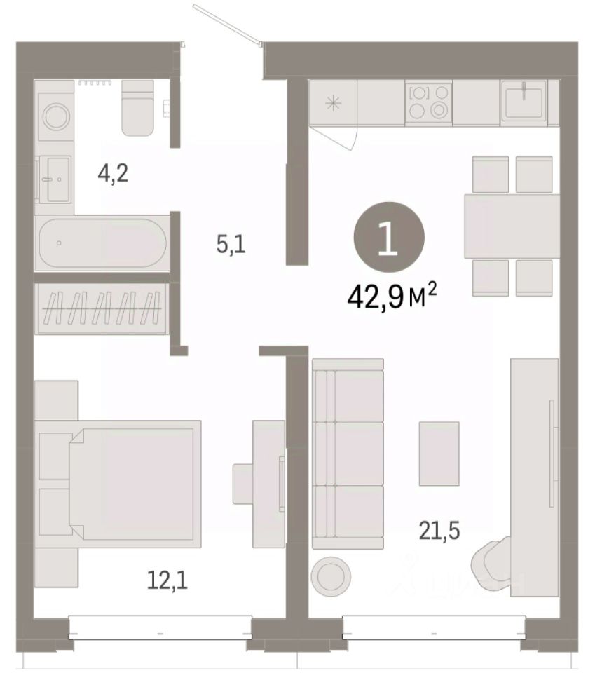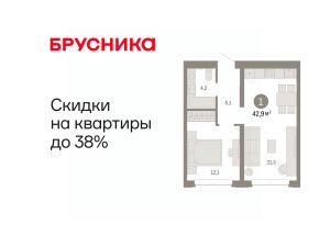 1-комн. квартира с предчистовой отделкой в Кварталы "На Минской" на 2 этаже. Общая площадь: 42.85 кв.м., жилая: 12.1 кв.м., площадь просторной кухни-гостиной: 21.5 кв.м. Все окна выходят на одну сторону. В квартире один совмещенный санузел. Высота потолков 2.7 м.