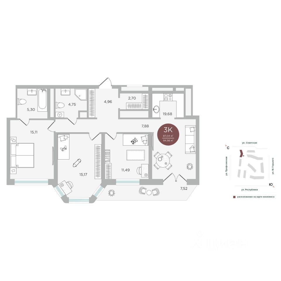 Общая площадь87,04 м²