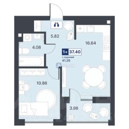 Прекрасная новостройка располагается на 13 этаже 21-этажного дома и имеет всего 1 комнату площадью 37.40 кв.м. Кухня здесь также просторная - 16.64 кв.м.