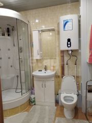 Caнузeл совмещенный, просторный, уложена кафельная плитка на пол и стены, установлена душевая кабина и водонагреватель на 80 литров.