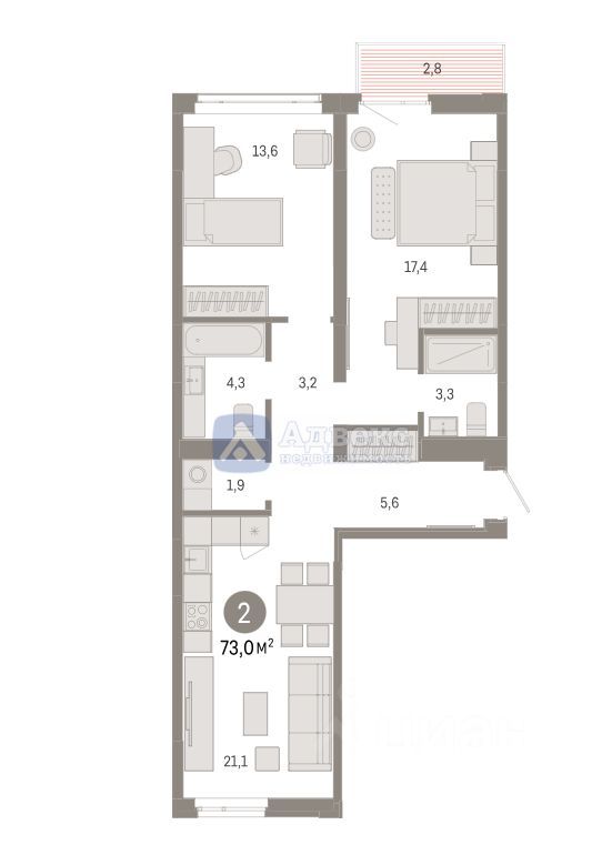 Площадь квартиры 73.00 кв.м., просторная кухня 21.1 кв.м. Отличное сочетание цены и качества делает этот вариант привлекательным как для семей с детьми, так и для молодых людей.